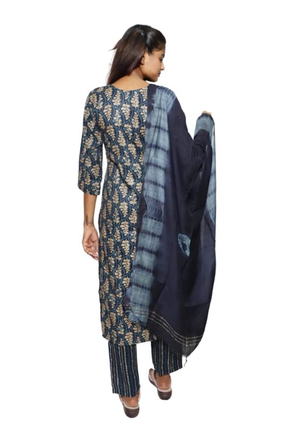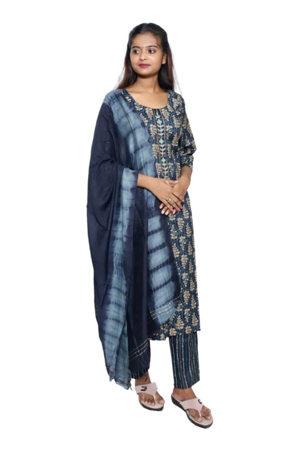 Straight dress 3-piece nevi blue work on neck printed navy blue kurti pant dupatta set features Three-quarter sleeves. Complemented with matching Palazzos with an Elasticated waistband. Highlighted with Printed, this style is perfect for Casual wear.