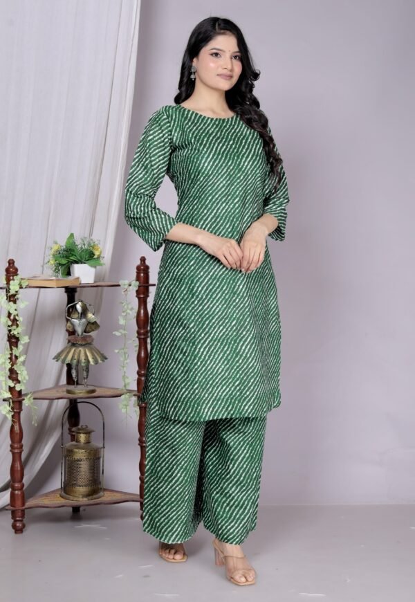 Cod set 2 piece Green Lahariya Jaipuri print with cotton febric long kurti pant cord set features Three-quarter sleeves. Complemented with matching Palazzos with an Elasticated waistband. Highlighted with Printed, this style is perfect for Casual wear.